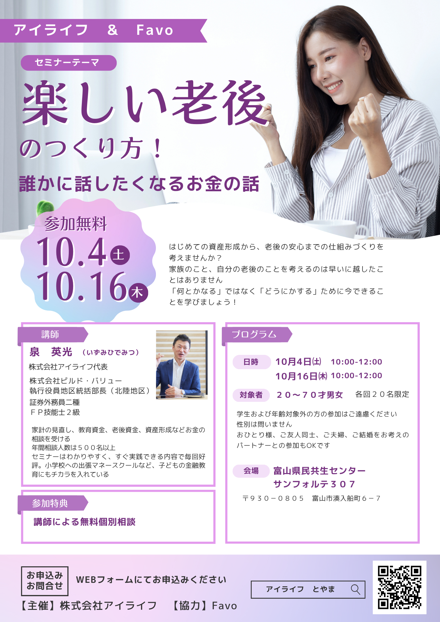 ※やむなく内容や詳細が変更になる場合は、メールにてご案内させていただきます ※ご提供いただいた個人情報を第三者に提供することはございません。後日、セミナーなどのご紹介の目的で主催者が当該個人情報を利用することがあります ※保険会社、証券会社勤務の方など関係者のご参加はご遠慮いただいております ※本セミナーにおいて、証券、保険などの金融商品の勧誘は一切ございません |